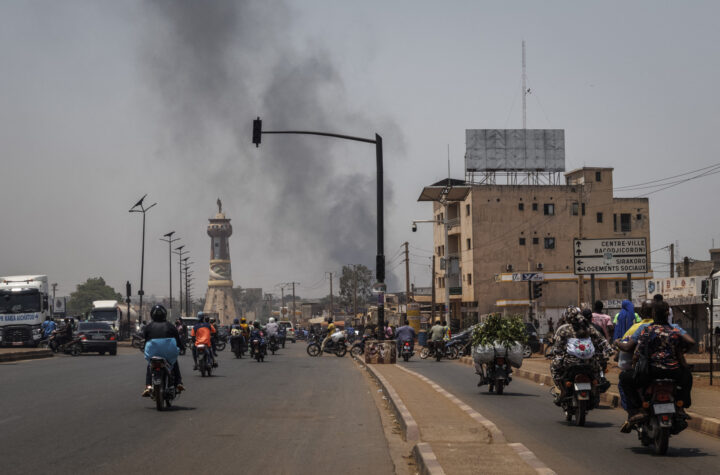 TOPSHOT - A column of black smoke rises above buildings as traffic passes the Africa Tower monument in Bamako on April 26, 2026. April 25, 2026's shock attacks, synchronised by Tuareg rebels of the Azawad Liberation Front (FLA) coalition and the jihadist Group for the Support of Islam and Muslims (JNIM), targeted several areas in the vast arid country. Fighting resumed on April 26 in several areas, including Kita near Bamako, Kidal, Gao and Severe. Tuareg rebels meanwhile announced an agreement allowing Russian forces backing Mali's army to withdraw from the northern city of Kidal, which they claimed was "totally" under their control. (Photo by AFP via Getty Images)